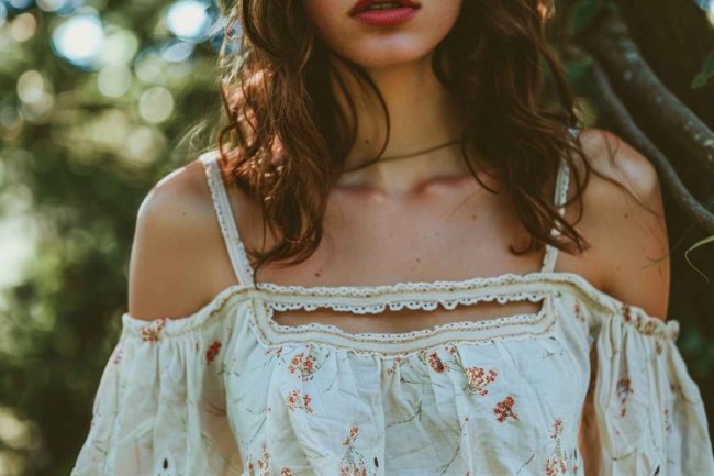 - Нотки романтичности образу придадут блузки с открытыми плечами. Встречаются дизайны с лаконичным вырезом в виде глубокой «лодочки» или с дополнением широким воланом, придающим дополнительной женственности.