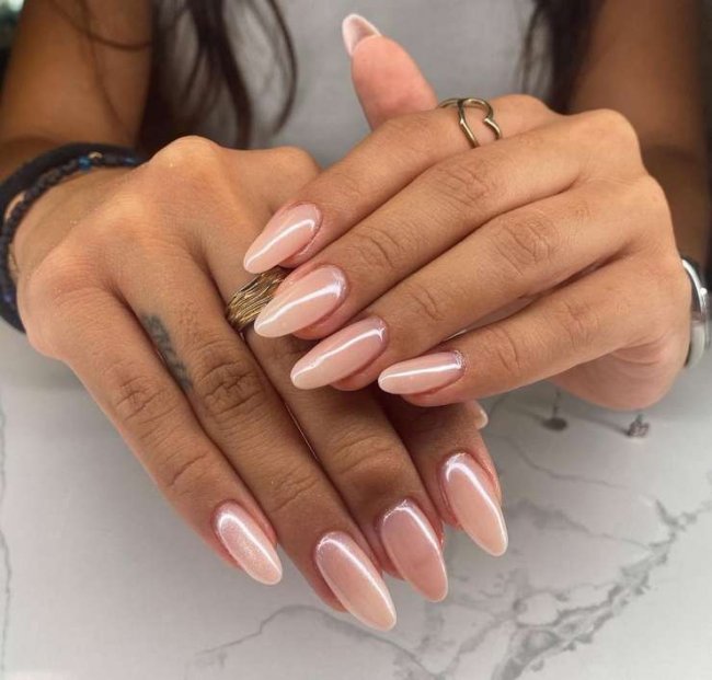 Для поклонниц холодных оттенков наш мастер подготовил суперлетнюю идею. Арина: «Втирка не выходит из топа еще с зимы, причем большинство моих клиентов не могут остаться равнодушными к холодным оттенкам втирки даже в теплое время». Смотрите, чтобы базовый цвет не конфликтовал с температурой втирки.