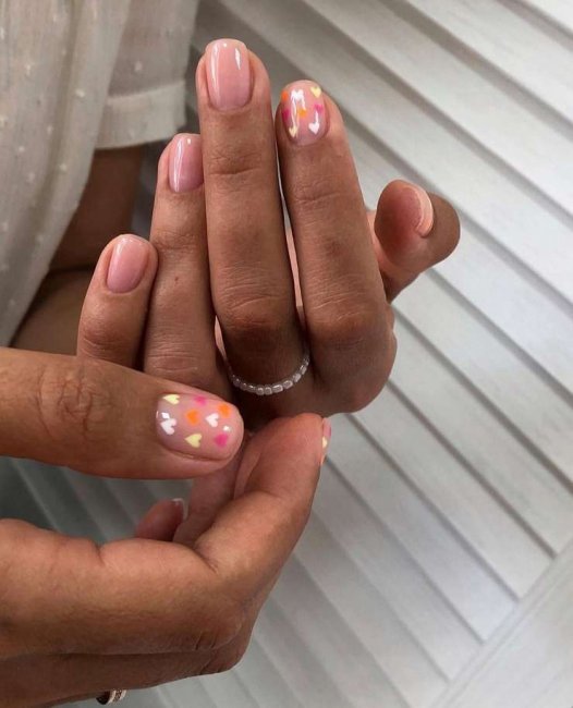 Если весной мы выбирали графичный минимализм в сдержанных оттенках, то летом можно расслабиться. «Россыпь цветных сердечек или цветов на нескольких ногтях — то, что нужно в летний сезон. Главное, не увлекайтесь и не просите сделать дизайн на все ногти — это скучно», — поясняет Арина.