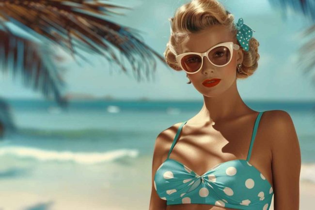 - Особого внимания заслуживает винтажный стиль. Отражением ретро моды, активно вернувшейся в современность, станут купальники в стиле пин-ап. Характерные черты таких моделей – закрытые плавки с высокой посадкой, лиф с широкой бретелью, перекинутой через плечо. Дополнительное сходство с винтажем придаст крупный горошковый принт.