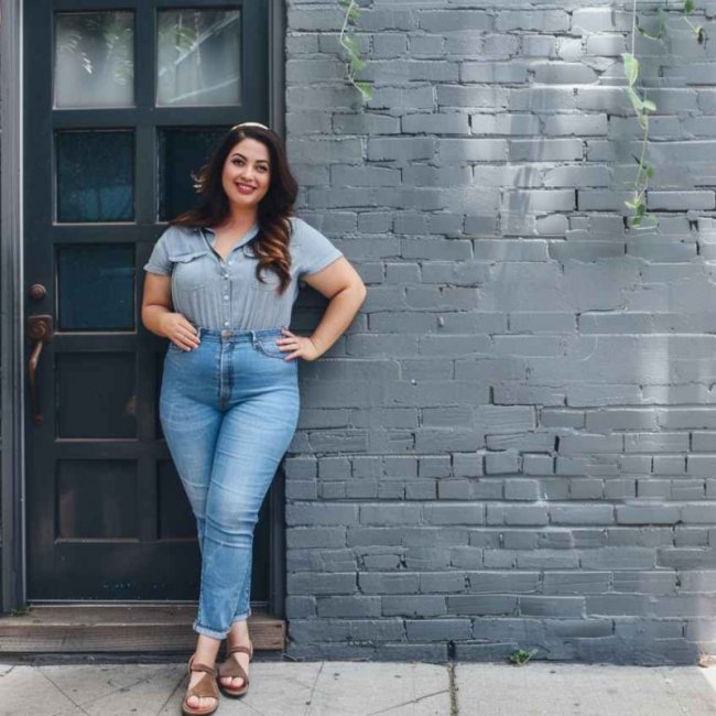 - Джинсы представлены универсальными фасонами мом, слоучами, характеризующимися легким сужением штанин книзу. Также пользуется популярностью клеш от колена, который хорошо смотрится на полной фигуре. Обязательное условие – высокая посадка, которая помогает скрыть проблемные места в области талии и живота.