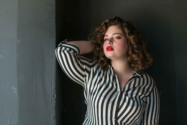 - Продолжает оставаться востребованным такой тренд моды для полных, как рубашка строгого классического кроя, доходящая по длине до нижней части бедер и дополненная продольной полоской. Такой принт способствует зрительному вытягиванию силуэта и придает ему визуальную стройность.