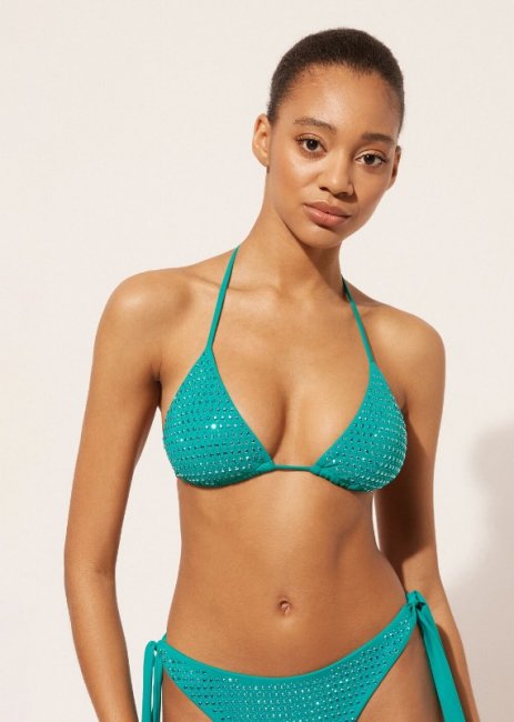 Невозможно пройти мимо нарядных вариантов. Такой комплект обязательно должен попасть в отпускной чемодан и украсить вас на пляжной фотосессии. Красиво смотрятся купальники со стразами и бусинами – пусть и не самые практичные, зато очень привлекательные.