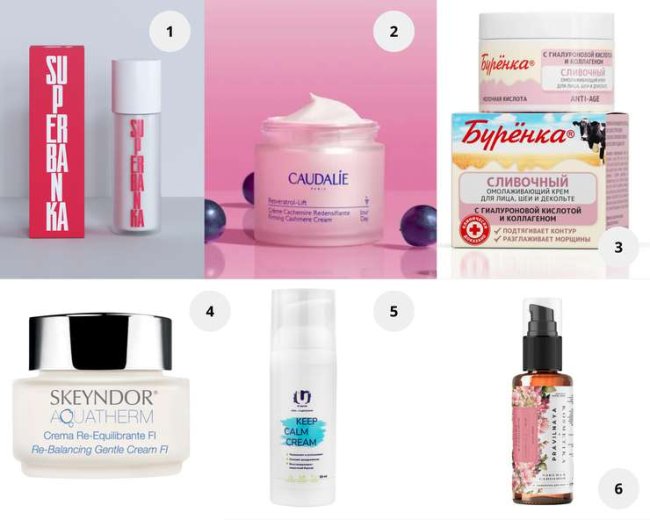 1. Тонизирующий крем для лица SUPER AFTERPARTY, SUPERBANKA. 2. Укрепляющий дневной крем-кашемир Resveratrol-lift, Caudalie 3. Крем сливочный омолаживающий для лица, шеи и декольте, Буренка. 4. Специальный антивозрастной крем в увлажняющей линии Aquatherm, Skeyndor. 5. Крем с центеллой Keep Calm Cream, THE U. 6. Жидкие патчи для глаз Сакура и кардамон, Pravilnaya Kosmetika.