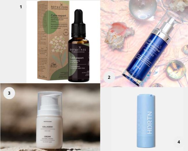 1. Стимулирующая сыворотка для нормальной и зрелой кожи TONE & ELASTICITY, Botavikos. 2. Anti-age крем для лица и зоны декольте с морскими пептидами и нуклеиновыми кислотами, HydroBionique. 3. Крем Collagen+ ламеллярный с фосфолипидами лецитина, Booster Bar. 4. Увлажняющая сыворотка, Don’t Touch My Skin HYDRATION.