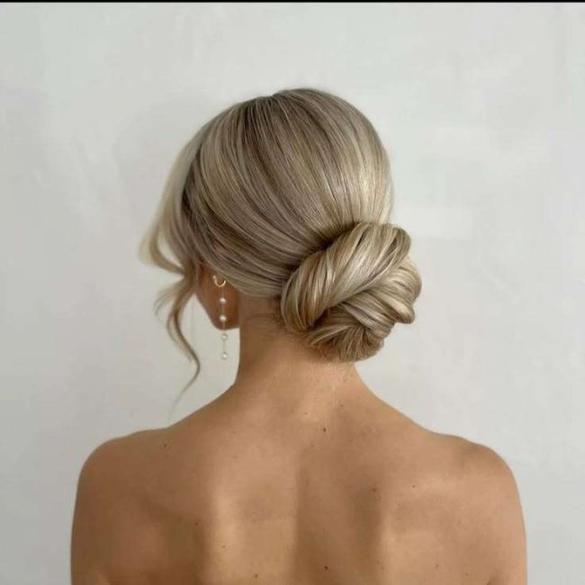 Соберите волосы пониже, не затягивая туго. Вытяните пряди у лица для мягкости, зафиксируйте невидимками. Добавьте текстуру спреем с сахаром.