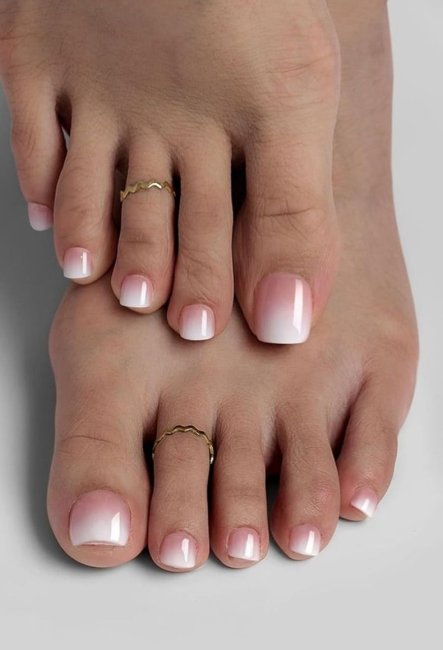 Отдельного внимания заслуживает градиентный френч. Плавная растушевка от розового к белому или от нюда к молочному создает ухоженный эффект без четкой линии. Преимущество такого варианта — универсальность. Он хорошо смотрится даже на коротких ногтях, не требует заметной длины и визуально выравнивает пластину. Размытый переход делает педикюр спокойным, поэтому он особенно уместен весной, когда хочется легкости. Градиент можно выполнить в классической гамме или поэкспериментировать с пастельными оттенками (персиковым, лавандовым, голубым). Главное соблюдать плавность и отсутствие резких границ.