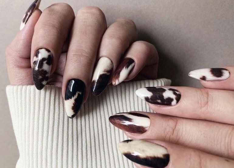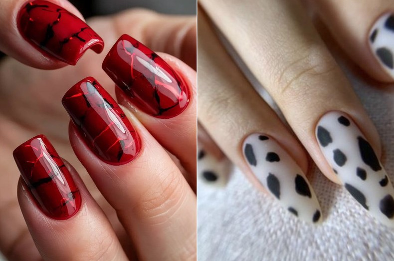 Отдельный тренд, который пошел с подиумов в народ — принт далматинца. Это идеальная замена классическому горошку для тех, кто хочет чего-то свежего. Белая база и хаотичные черные пятна разного размера выглядят игриво, но стильно. Особенно, если добавить на один ноготь красный акцент.