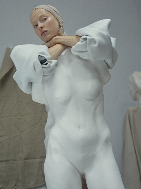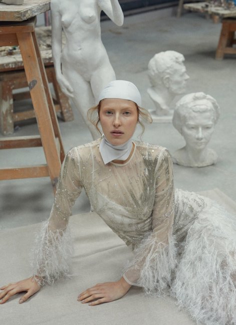 Окруженные красотой скульптурной студии, мы начали собирать каждый образ по частям, чтобы показать начало творческого процесса. Модель - манекен - была нашей скульптурой, а также источником вдохновения. Большая часть одежды, которая надета на модели, была сшита непосредственно перед или во время съемки. Мы сшили и переделали некоторые предметы одежды - например, винтажные платья Chloé и Gucci или старые брюки Isabel Marant, - чтобы они могли оставить пространство для воображения и творчества. А, возможно, стать началом чему-то еще".