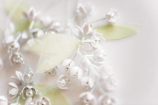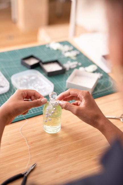 Она создала декор haute couture, используя в качестве сырья не ткань или вышивку, а бумагу. Сложные трехмерные украшения полностью созданы вручную: ландыш в полном цвету, изящно переходящий к вершине флакона.
