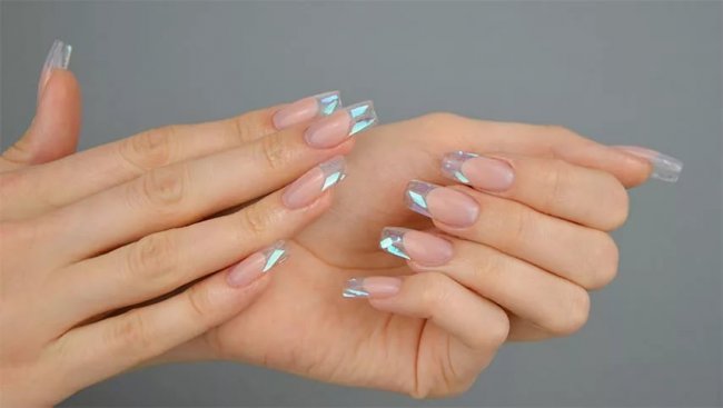 Стеклянный френч – это наращивание, при котором свободный край выполнен прозрачным материалом, такой вид френч — наращивания выполняется только с удлинением ногтевого ложа. Это необходимо, для того, чтобы не было видно, где заканчивается свой ноготь и начинается искусственный. Может быть выполнен на формах и на прозрачных типсах.