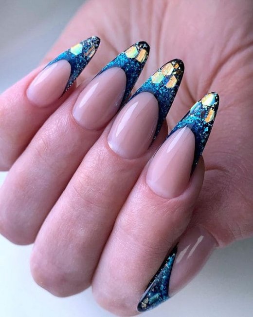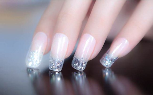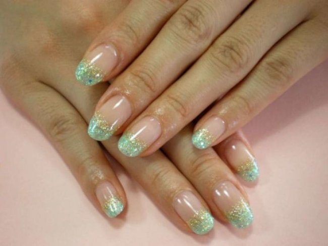 Фан-френч или френч миллениум. Свободный край выполняется блестками, бульенками, микропылью и проч. Как правило, выполняется на формах, может быть с удлинением и без.