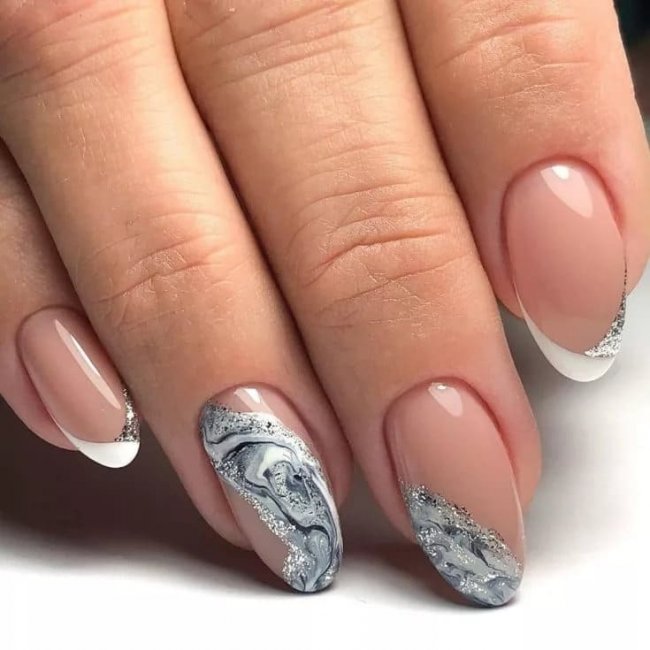 Мраморный френч. При таком виде наращивания на свободном крае ногтя цветными акрилами или гелями, контрастных или одинаковых по цвету, но отличающихся оттенком цветов, создаются красивые «разводы» напоминающие мрамор.