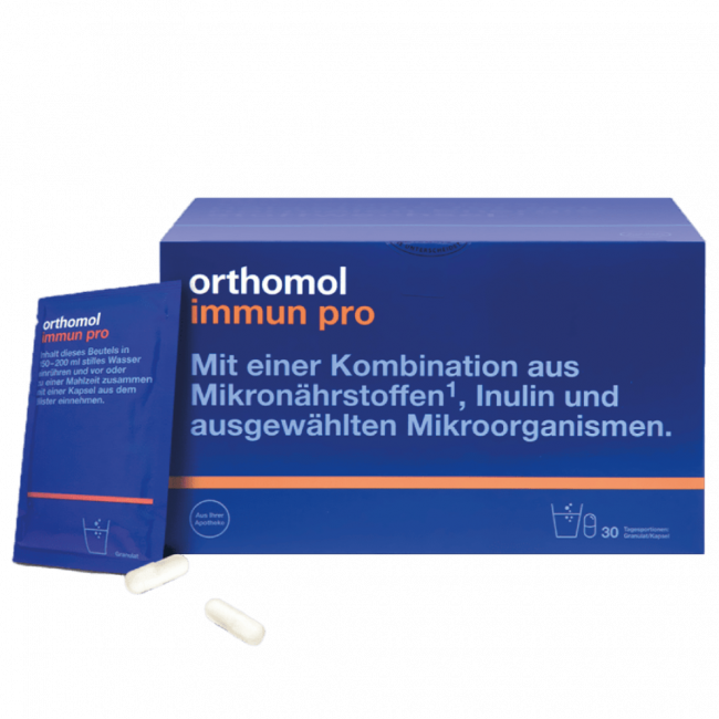 Витамины Orthomol Immun ProВитаминно-минеральный комплекс для повышения местного иммунитета желудочно-кишечного тракта, который особенно полезно употреблять после приема сильнодействующих препаратов. Комплекс помогает укрепить иммунитет, противостоять вирусным инфекциям, восстановить микрофлору кишечника. Основными компонентами Orthomol Immun Pro являются инулин, лакто и бифидобактерии, витамины А, С и Е, биотин и ниацин, цинк, селен, медь и марганец.