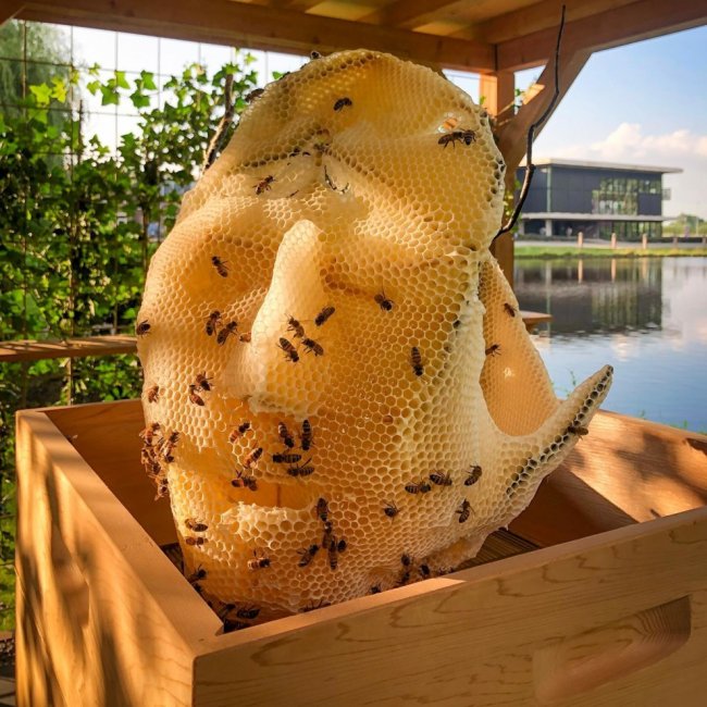 Він виготовляє тривимірний металевий каркас і дає бджолам змогу розміщувати на ньому стільники. Це дуже довга й копітка праця: комахи місяцями вибудовують стільники навколо металевих лозин. "Архітектура, запозичена в природи", – каже Томаш.