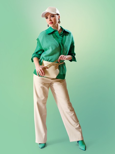Образ в хорошо узнаваемой стилистике Gucci выглядит ярко за счет зеленого, самого хитового цвета последних сезонов. Широкие брюки из экокожи скомплектованы с рубашкой и жилетом в стиле семидесятых. Современности добавят аксессуары: кепка и сумочка с цепью.