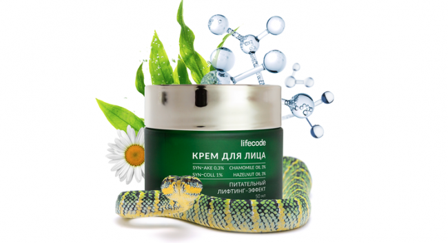 Производители крема смело заявляют: приобретая эту баночку, вы можете смело забыть об «уколах красоты». Наш бьюти-отдел пока еще тестирует новинку, но уже понятно, что на эту новинку однозначно стоит обратить внимание. Ведь его составе — уникальный миорелаксант SYN-AKE, схожий по своему действию с ядом храмовой гадюки. Это именно он активно борется с имеющимися морщинами и предотвращает появление новых, поскольку блокирует нервный импульс в мышце, что способствует снижению ее двигательной активности и расслаблению. Благодаря этому разглаживаются заломы и мимические морщины. SYN-AKE позволяет моментально достичь эффекта гладкой и подтянутой кожи, аналогичного результату салонной процедуры введения ботокса.
