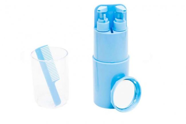 В комплект входят два дозатора по 45 мл каждый, зеркало и гребень. В задний отсек органайзера можно вложить зубную щетку и маленькую зубную пасту. Крышку можно использовать в качестве стаканчика-подставки. Дозаторы дополнены стопперами, чтобы избежать протечки содержимого. Можно выбрать органайзеры разных цветов — если, к примеру, едете семьей и вам нужно их несколько штук. Например, красный органайзер для себя и синий — для своей второй половины.