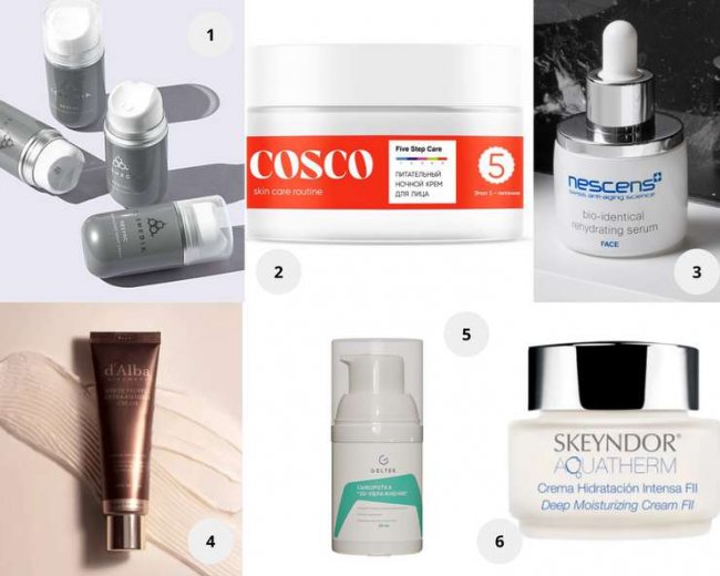 1. Ночной восстанавливающий крем с тепреноном, Resync, COSMEDIX. 2. Питательный ночной крем для лица, Cosco. 3. Сыворотка биоидентичная увлажняющая, Bio-Identical Rehydrating Serum Face, Nescens. 4. Лифтинг-крем для лица White Truffle Extra-Firming Cream с коллагеном, гиалуроновым комплексом и ниацинамидом, d’Alba. 5. Сыворотка «3D-увлажнение», Geltek. 6. Крем глубокого увлажнения с пептидами Aquatherm, Skeyndor.