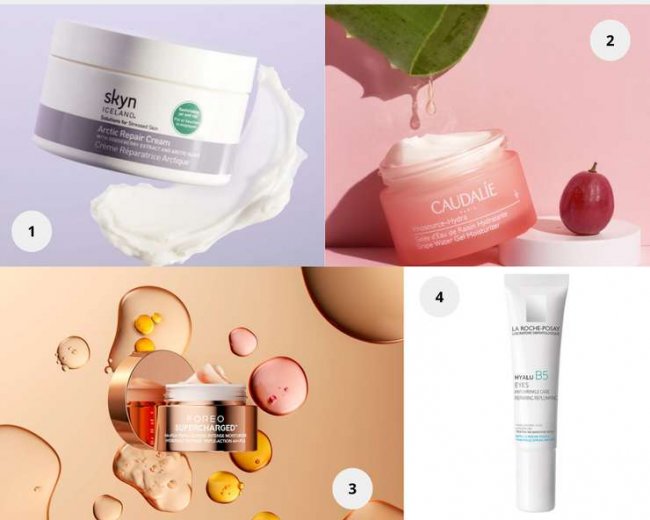 1. Увлажняющий крем Arctic Repair Cream для лица и тела, Skyn Iceland. 2. Увлажняющий крем-гель с виноградной водой из обновленной линейки Vinosource-Hydra, Caudalie. 3. Насыщенный гель-крем все-в-одном HA+PGA Triple Action Intense Moisturizer, FOREO. 4. Увлажняющий концентрат против морщин для лица и кожи вокруг глаз HYALU B5, La Roche-Posay.