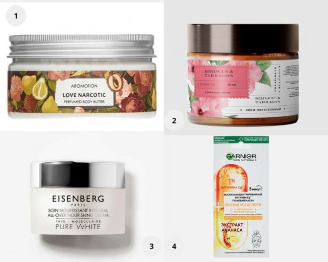 1. Крем-баттер Love Narcotic, Aromotion. 2. Крем питательный для лица, шеи и декольте, Гибискус & Эстрагон, Pravilnaya Kosmetika. 3. Ночной крем Интегральный питающий уход Soin Nourrissant Intégral, EISENBERG. 4. Высококонцентрированная тканевая маска Витамин Cg'' Против усталости, Garnier.