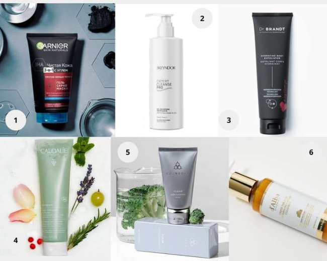 1. Гель + Скраб + Маска 3-в−1 с углем, Garnier. 2. Двухфазное средство для глубокого очищения кожи из линии Expert Cleanse Pro, Skeyndor. 3. Скраб-микродермабразия, Dr.Brandt. 4. Очищающий гель для умывания Vinopure, Caudalie. 5. Маска для глубокого очищения Clear, Cosmedix. 6. Гидрофильное масло и пенка 2в1 White Truffle Return Oil Cream Cleanser, d’Alba.
