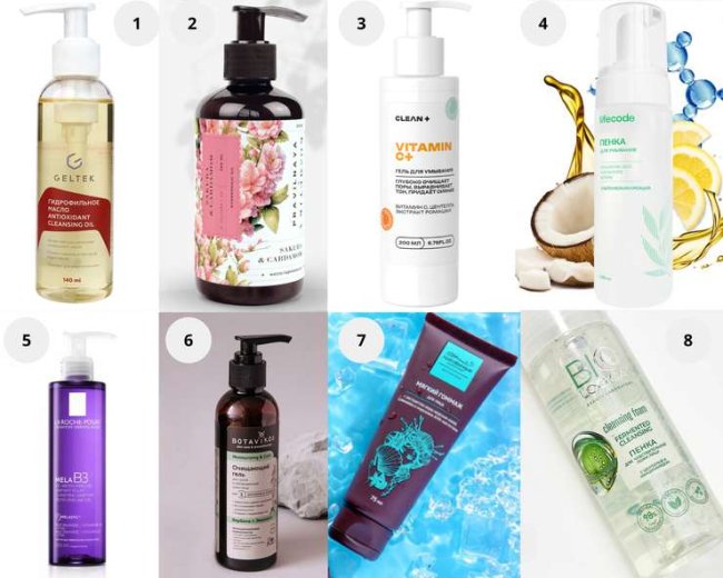 1. Гидрофильное масло Antioxidant Cleansing Oil, Geltek. 2. Гидрофильное гель масло для лица для умывания и снятия макияжа, от черных точек, Фиалка и Дикая слива, Pravilnaya Kosmetika. 3. Гель для умывания, с витамином C, Clean+. 4. Пенка для умывания ультраувлажняющая с гиалуроновой кислотой, бетаином и ниацинамидом, Lifecode. 5. Очищающий гель-пилинг против пигментации MELA B3, La Roche-Posay. 6. Очищающий гель для сухой и обезвоженной кожи Moisturizing & Care, Botavikos. 7. Мягкий гоммаж для лица с икрой морских ежей, кремнием и морскими AHA-кислотами, HydroBionique. 8. Пенка для лица Fermented cleansing, Biologica.