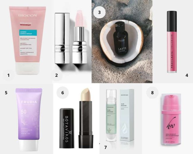 1. Увлажняющая маска для лица BIOCOS. 2. Бальзам для губ Baume Fusion, Eisenberg. 3. Кокосовое масло Latte SPF 6, SILQIE. 4. Масло для губ увлажняющее с ароматом Тутти Фрутти, Pravilnaya Kosmetika. 5. Легкий увлажняющий солнцезащитный крем с черникой, Frudia. 6. Солнцезащитный бальзам для губ SPF 15, Botavicos. 7. Бустер-сыворотка с органическим алоэ и полиглутаминовой кислотой ALOE BOOSTER, Booster Bar. 8. Крем вечерний восстановительный PERFECT SORBET.