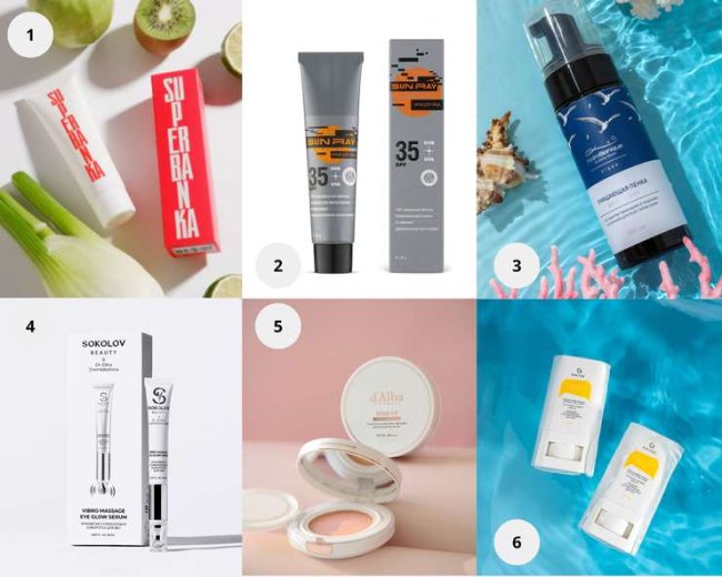 1. Увлажняющий крем для лица с пробиотиками Ace of Base, SUPERBANKA. 2. Солнцезащитный крем для лица SPF 35, Sun Ray. 3. Нежная пенка для умывания с ламинарией и морским коллагеном для всех типов кожи, Hydrobionique. 4. Мгновенно освежающая сыворотка для век Vibro Massage Eye Glow Serum, SOKOLOV BEAUTY. 5. Солнцезащитный кушон для осветления тона Waterfull Tone-Up Sun Cushion SPF50+ РА++++, d’Alba. 6. Солнцезащитный стик для лица SPF 50+, Geltek.