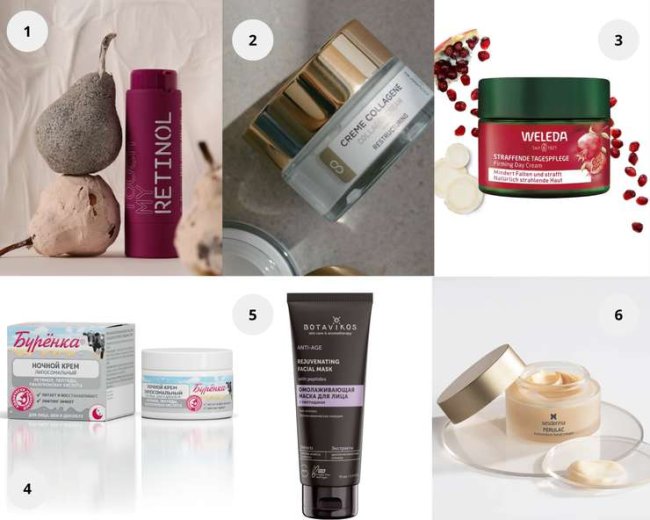 1. Сыворотка с ретинолом 0.4%, Don’t Touch My Skin. 2. Крем с морским коллагеном, Coveline. 3. Укрепляющий дневной крем-лифтинг, Weleda. 4. Крем ночной липосомальный для лица, шеи и зоны декольте, Буренка. 5. Антивозрастной крем с пептидами и скваланом для упругой и сияющей кожи ANTI-AGE, Botavikos. 6. FERULAC Крем антиоксидантный для лица с феруловой кислотой, Sesderma.