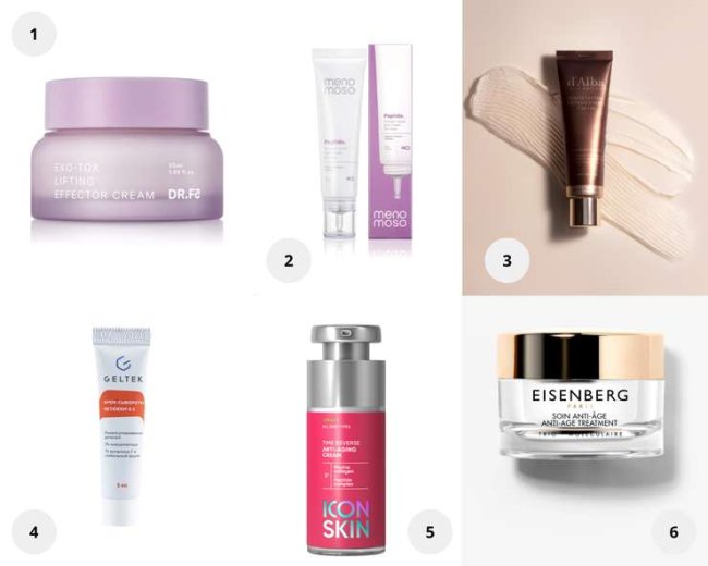 1. Антивозрастной крем для лица с бакучиолом, DR.F5. 2. Осветляющий крем с пептидами, Menomoso. 3. Лифтинг-крем для лица White Truffle Extra-Firming Cream с коллагеном, гиалуроновым комплексом и ниацинамидом, d’Alba. 4. Крем-сыворотка Retiderm 0.5 с инкапсулированным и свободным ретинолом 0.5%, Geltek. 5. Омолаживающий крем Time Reverse, Icon Skin. 6. Омолаживающее средство для лица, Eisenberg.