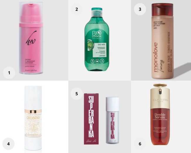 1. Пилинг с молочной кислотой PERFECT MILKPEEL, PREMIUM Homework. 2. Тоник для чувствительной кожи лица «Fermented cleansing», BIOLOGICA. 3. Питательный тоник-эссенция лица VEGAN MUSHROOM GLOW, monolove. 4. Антивозрастная сыворотка вокруг глаз White Gold, OROGOLD. 5. Крем для лица с пептидами Last Tango, SUPERBANKA. 6. Комплексная омолаживающая двойная сыворотка для лица Double Serum, Clarins.