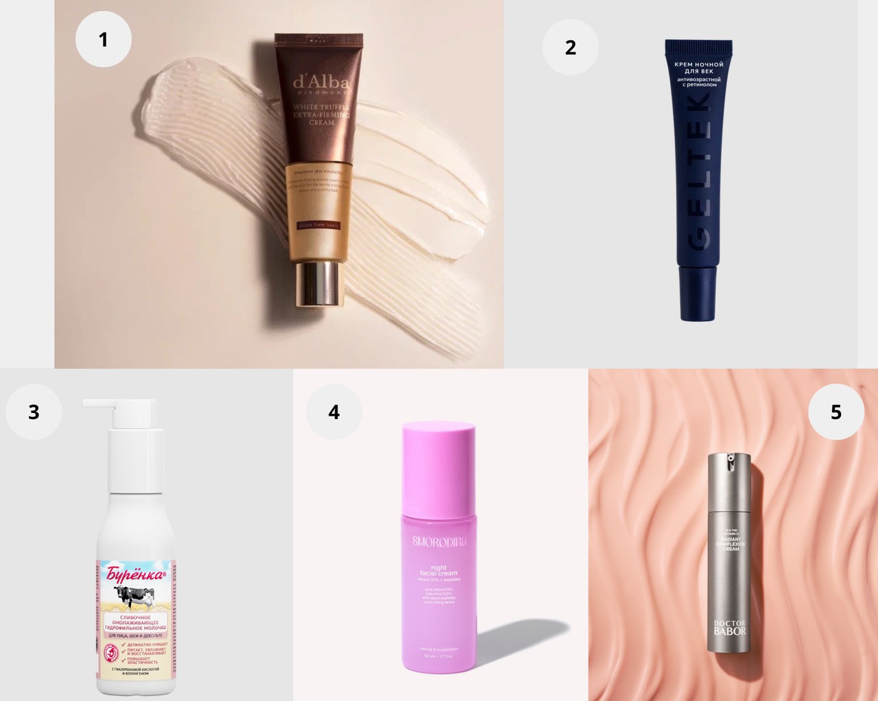 1. Лифтинг крем для лица White Truffle Extra-Firming Cream, d'Alba. 2. Крем ночной с ретинолом и антиоксидантами, Geltek. 3. Сливочное омолаживающее гидрофильное молочко для умывания и ухода, Буренка. 4. Ночной крем для лица с ретинолом и пептидами, SMORODINA. 5. Выравнивающий Крем для Сияния Кожи REFINE с витамином С нового поколения, DOCTOR BABOR.