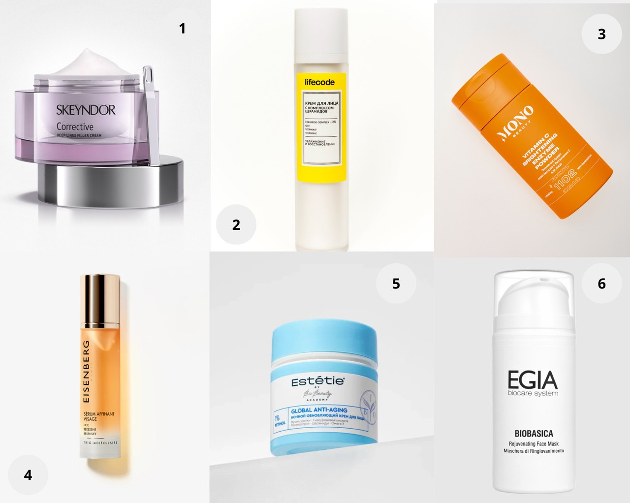 1. Крем-филлер Corrective, Skeyndor. 2. Крем для лица с комплексом церамидов, Lifecode. 3. Энзимная пудра с Витамином С, Mono Beauty. 4. Сыворотка, моделирующая овал, для лица и шеи, Eisenberg. 5. Ночной обновляющий крем для лица Global Anti-aging, ESTETIE. 6. Маска омолаживающая регенерирующая, EGIA Biocare System.