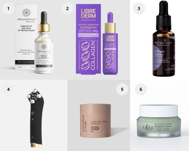 1. Сыворотка для лица от пигментации омолаживающая, PRIMADERMA. 2. PEPTIDE PRO лифтинг-сыворотка Моментальный эффект, Librederm. 3. Омолаживающая сыворотка ANTI-AGE для кожи вокруг глаз против мимических морщин, Botavikos. 4. Электромассажер FAQ 402, FOREO. 5. Увлажняющий крем для лица с камбучей, monolove. 6. Ультраувлажняющий и восстанавливающий крем Intensive Repair Probiotic Cream, ULU.