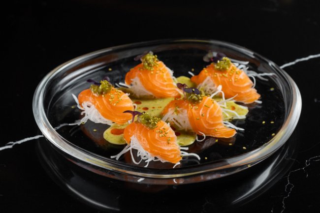 Сашими из лосося в соусе из лемонграсс и имбиря с кизами васабиТартар из лакедры на пюре из печеного баклажана с пикантным понзу – это возможность познакомиться с японской рыбой лакедра и пикантным соусом по секретному рецепту шефа.