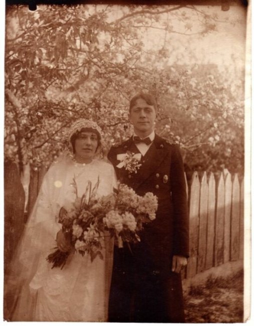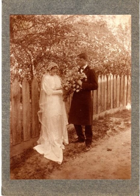 Цікаво, що фото здебільшого робили в студії – там було легше виставити світло і скористатися реквізитом. Та деякі молодята могли дозволити собі невимушеніші кадри – як подружжя Браїловських, що позує під квітучою вишнею на тлі дерев’яного паркана.