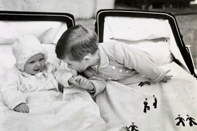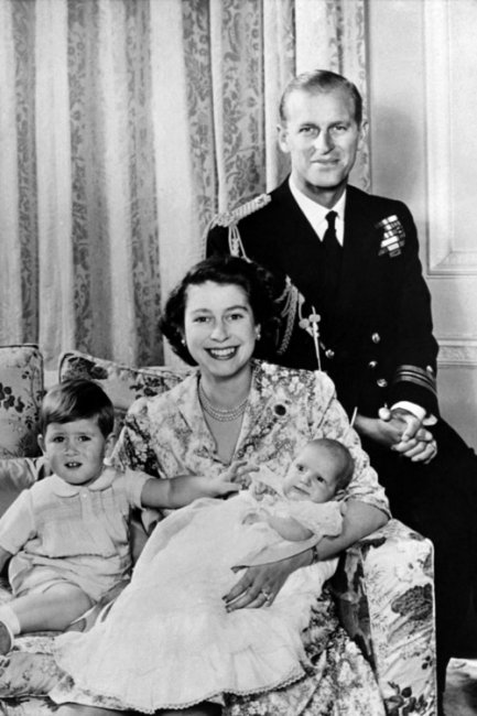 27 / 28Королева Єлизавета II і принц Філіп з дітьми принцом Чарльзом і принцесою Анною, 1950 рік
