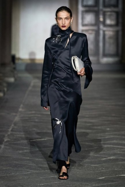 Струящийся атлас – один из излюбленных материалов в подиумных коллекциях текущего сезона. Если кружево, декорирование бантами, гороховый и анималистичный принты подойдут поклонницам сложных и эксцентричных образов, то любительницы минимализма оценят вещи из атласа. Благодаря патетичному блеску, он притягивает к себе максимум внимания, не оставляя модниц незамеченными.