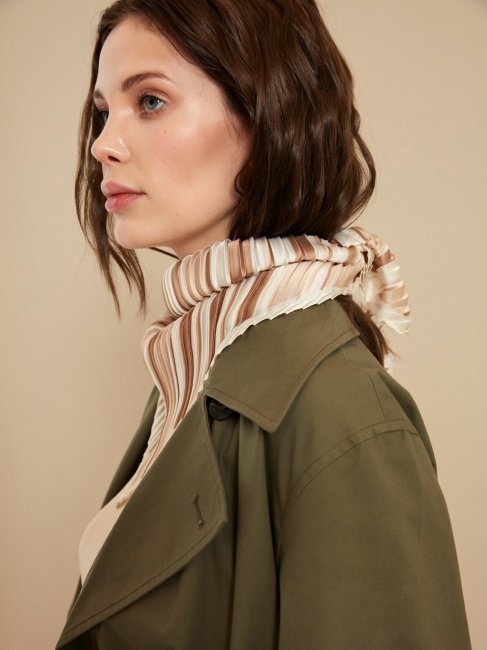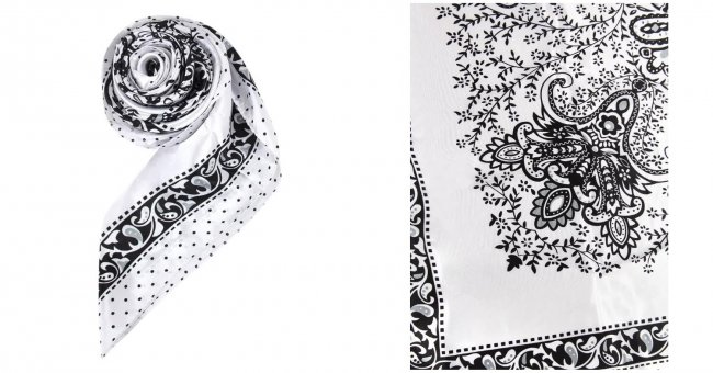 Этот аксессуар с актуальным геометрическим принтом преобразит однотонный образ. Четкие линии, рябящие точки и прямые углы будто создают направление, которое ведет в одну сторону — к стилю. Используйте такие косынки в качестве украшений для волос, подвязывайте на пояс или на сумку-шоппер — творческий подход только приветствуется.