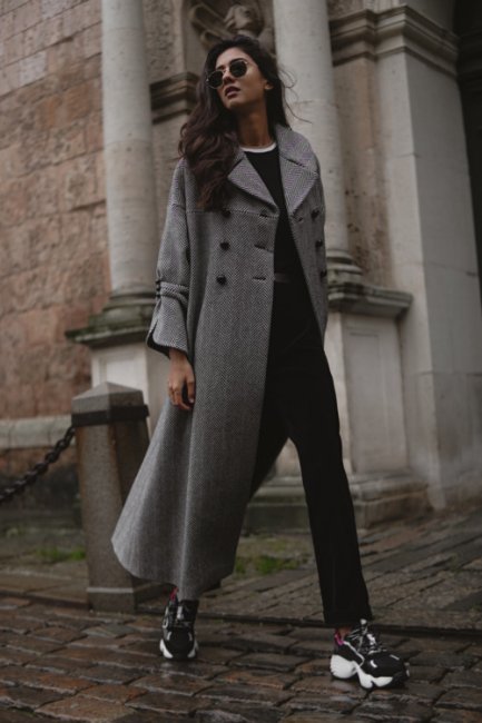 Вики Панда в пальто Emporio ArmaniВики выбрала двубортное пальто свободного кроя с объемными романтичными рукавами и отложным воротником. Такую модель легко подружить с брючным костюмом и лодочками и отправиться на деловую встречу или скомбинировать с денимом и ботинками для более неформального мероприятия. Вики предпочла сочетание серого пальто с черными брюками и кроссовками.