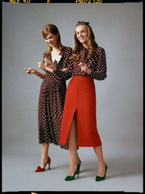 Платье, Alexa Chung; белый цветок, Philosophy; красные туфли, Aquazzura; блуза, Alexa Chung; юбка, Red Valentino; зеленые туфли, SJP