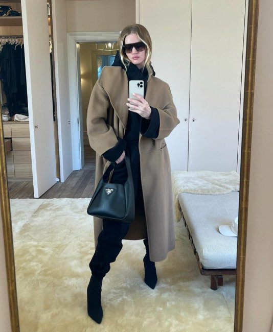 Рози Хантингтон-УайтлиВо-первых, Хантингтон-Уайтли выбирает монохромные костюмы, преимущественно приглушенных оттенков, которые легко сделать частью сложного многослойного образа и комфортно себя чувствовать даже в морозную погоду. Так, во время пеших прошулок британка предлагает сочетать мягкий костюм с классическим бежевым пальто и минималистичной сумкой Celine, но при этом спортивное настроение образа поддерживает бейсболкой и кроссовками. Серый костюм Рози сочетает с белым длинным пальто, что мгновенно делает образ торжественным, а модный акцент здесь – миниатюрная сумочка Bottega Veneta. Не боится модель сочетать спортивный теплый костюм и с каблуками, заправляя штанины в сапоги с широким голенищем. А завершает этот образ пушистая дубленка.