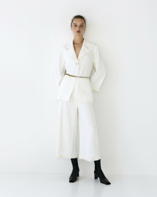 The Coat by Katya SilchenkoБелая двойкаСветлана Бевза умеет и любит работать с белым цветом, а в ее руках он никогда не выглядит слишком строго или скучно. В коллекции сезона весна-лето 2021 дизайнер представила белоснежную двойку, состоящую из жакета и кюлотов, которая станет отличной заменой классическому брючному костюму и заметно оживит деловой гардероб.