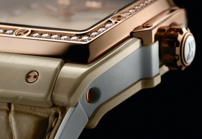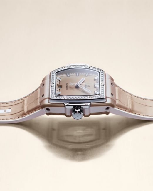 Модель Spirit of Big Bang Ceramic Beige с серовато-бежевым ремешком из кожи аллигатора на белой каучуковой подкладке, циферблатом песочного цвета с узором «солнечные лучи» и безелем из уникального золота King Gold или полированного титана украшена 50 бриллиантами.