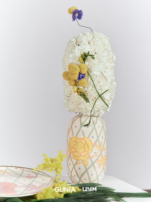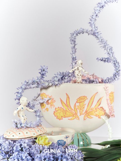 GUNIA х ЦУМЛимитированная серия изделий из фаянса GUNIA х ЦУМ изготовлена и расписана вручную. Отправной точкой при создании коллекции послужили сочетания традиционных форм и техник с новой функциональностью. Вазы и пиалы декорированы игрушечными фигурами и расписаны весенними цветами из ретро-открыток. В коллекции также представлены свечи с ароматом розового мороженого и шелковые банданы с цветочными узорами, херувимами и орнаментами из украинских полотенец.
