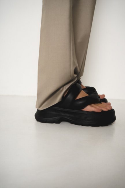 Этот характер интерпретирован и в самом дизайне. Привычные массивные каблуки сменила шпилька и kitten heel, которые особенно акцентированно выглядят совместно с геометрическим носком и прямоугольными эллементами в пяточной части. Помимо сапог-чулок и ботильон в коллекцию вошли минималистические туфли и мюли, а также кроссовки и сандалии-вьетнамки на массивной платформе. Дополнением стали украшения из ювелирного сплава: браслеты и колье, которые поддерживают общую концепцию.