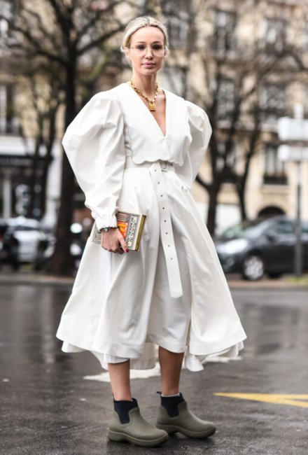 Лучшими помощниками во время переменчивой весенней погоды станут низкие резиновые сапоги. Такие в свой гардероб уже добавили Эмили Синдлев и Александра Голованофф. Согласно streetstyle-звездам главной стилистической партией для них будут мини-юбки из кожи или денима, струящиеся платья и шелковые сорочки. Не стоит забывать и о хите прошлого сезона: блузы с отложным воротником сгладят угрюмость обуви и привнесут в образ недостающую нежность.
