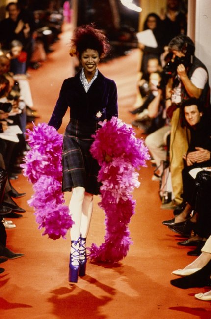 Gianni Versace весна-лето 1991Vivienne Westwood осень-зима 1993/94"Для меня она самая красивая женщина на планете. Это было шоу в клубе для французских патриотов. Мы делали его в очень камерном формате, поэтому проводили трижды, а ее знаменитое падение произошло как раз в первом. Но она смогла потом выйти дважды. Оглядываясь назад, мне кажется, что это был один из самых красивых моментов – она была похожа на модель, падающую в замедленном темпе. Еще Наоми делает такую удивительную благотворительную работу, особенно для больных СПИДом и беженцев, что это восхищает. Она действительно богиня, которая умеет заставлять вещи двигаться", – Вивьен Вествуд.