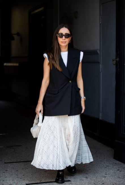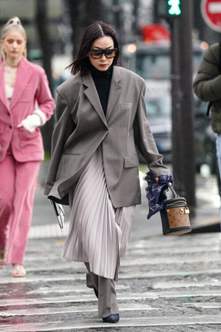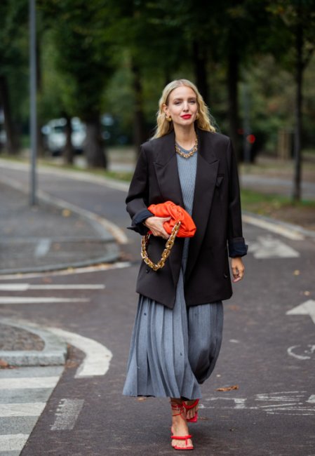Излюбленный элемент модниц, пиджак, словно заимствованный у бойфренда, - универсальная единица женского гардероба. Он хорош собой и в классическом тандеме с брюками, и в расслабленном комбо с джинсами, и в романтичном образе с юбкой-плиссе. Подсмотреть варианты стилизации можно у Леони Ханне, которая дополнила юбку графитовым пиджаком и яркими аксессуарами. Еще одним нескучным обыгрыванием образа станет жилет с мужского плеча и лаковые лоферы.